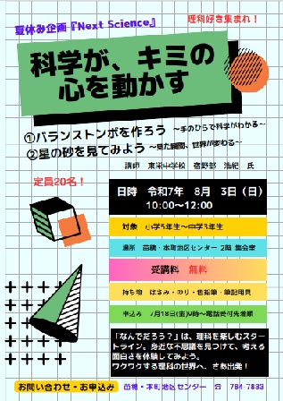 夏休み子ども企画2025第2弾!センター初、小学校高学年~中学生を対象とした『工作と実験』科学のイベントを開催します。理科に苦手意識のある子、理科好きな子、長い夏休みの中の1日センターに来て楽しい時間を過ごしましょう!