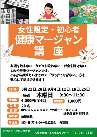 ☆8月4日受付開始★女性限定・初心者健康マージャン講座‼