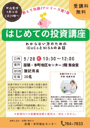 教えて佐藤FPシリーズ今年度第1弾『はじめての投資講座』です。今、TVや新聞などで取り上げられている投資ですが、気になってはいるけれどおっかなくて話を聞きに行けない!聞きに行く1歩が踏み出せない、そんな方を対象に開催いたします。やる・やらないは置いといて、まずは聞いてみませんか?