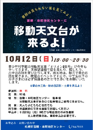 ☆9月29日受付開始★今年も移動天文台が来るよ‼