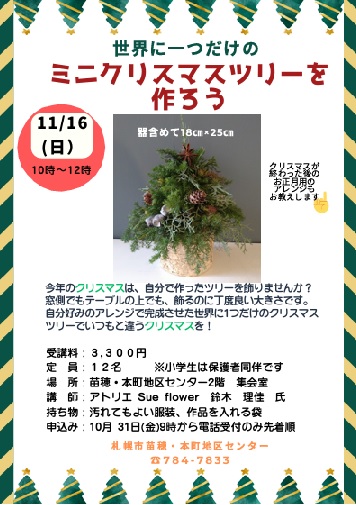 自分で作ることが好きな皆さん!一緒にミニクリスマスツリーを作りませんか?飾るのに丁度良い大きさですし、クリスマスが終わったら、お正月用にアレンジも出来て、長~く鑑賞出来ますよ!自分で作ったミニツリーで特別なクリスマスを。